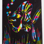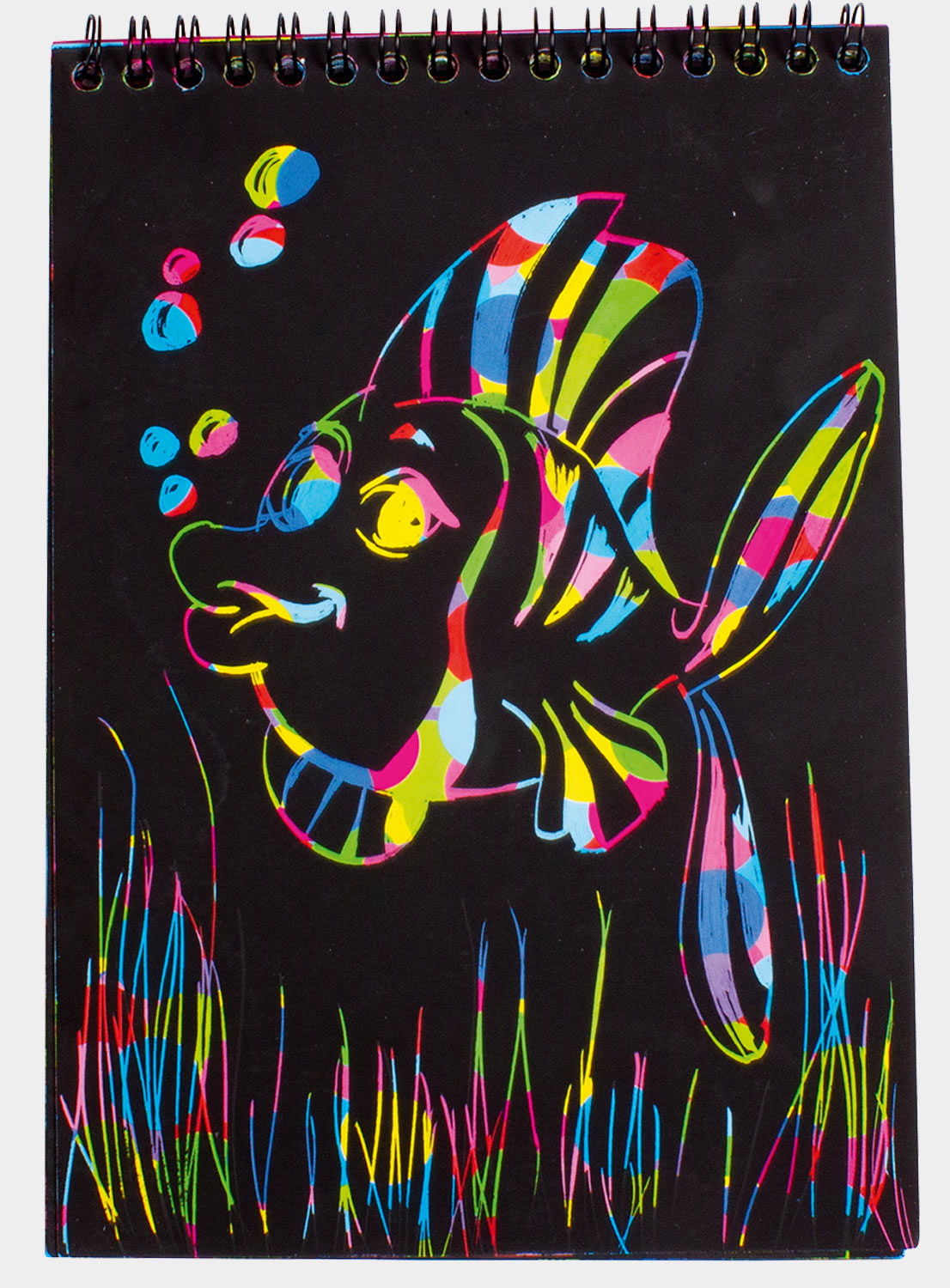 Spiralblock med 12 ark skrapblad + skrappenna i trä. Skrapa! Var kreativ och skapa fram dina egna konstverk i regnbågens färger. Barnen älskar det!
