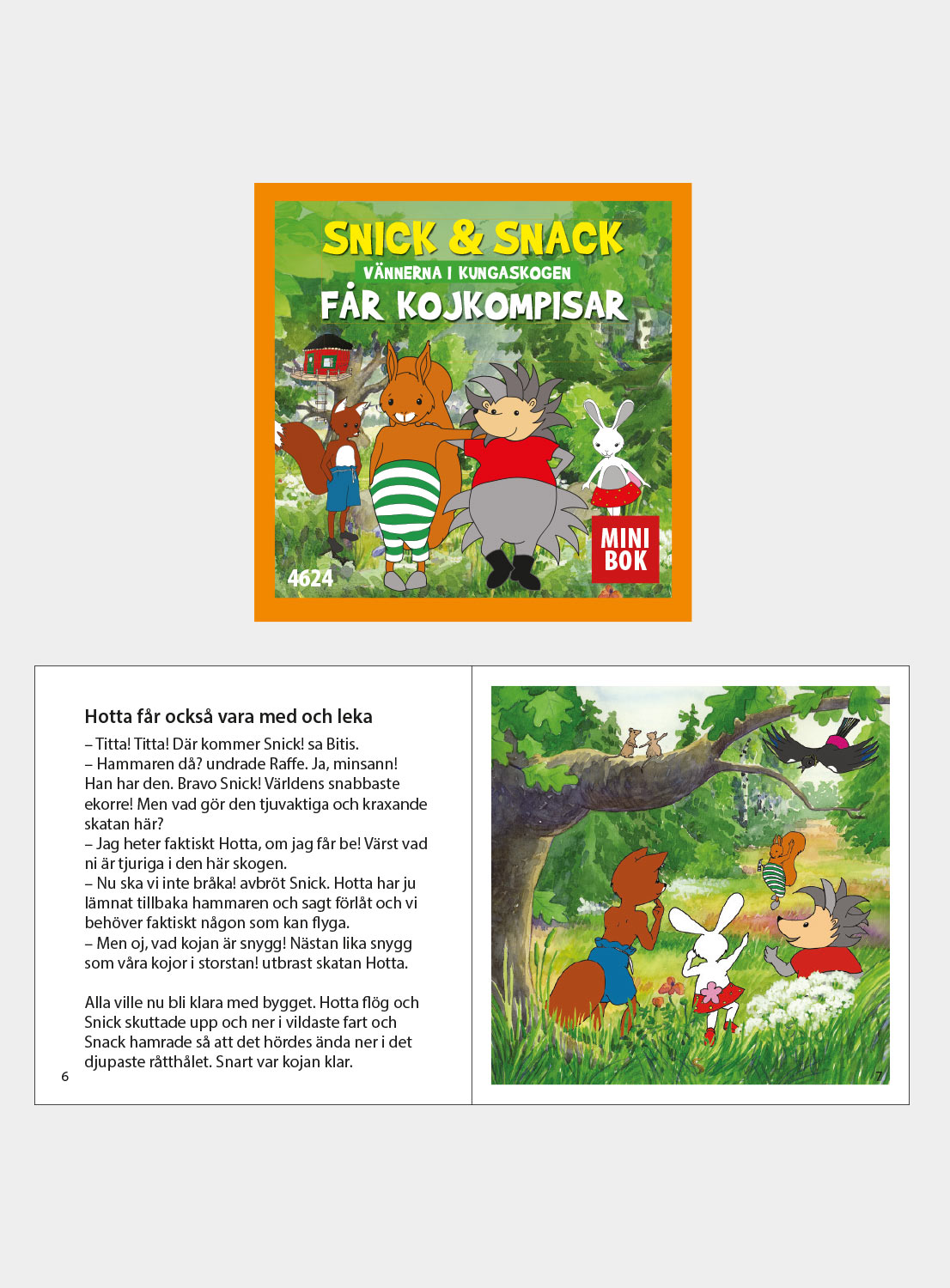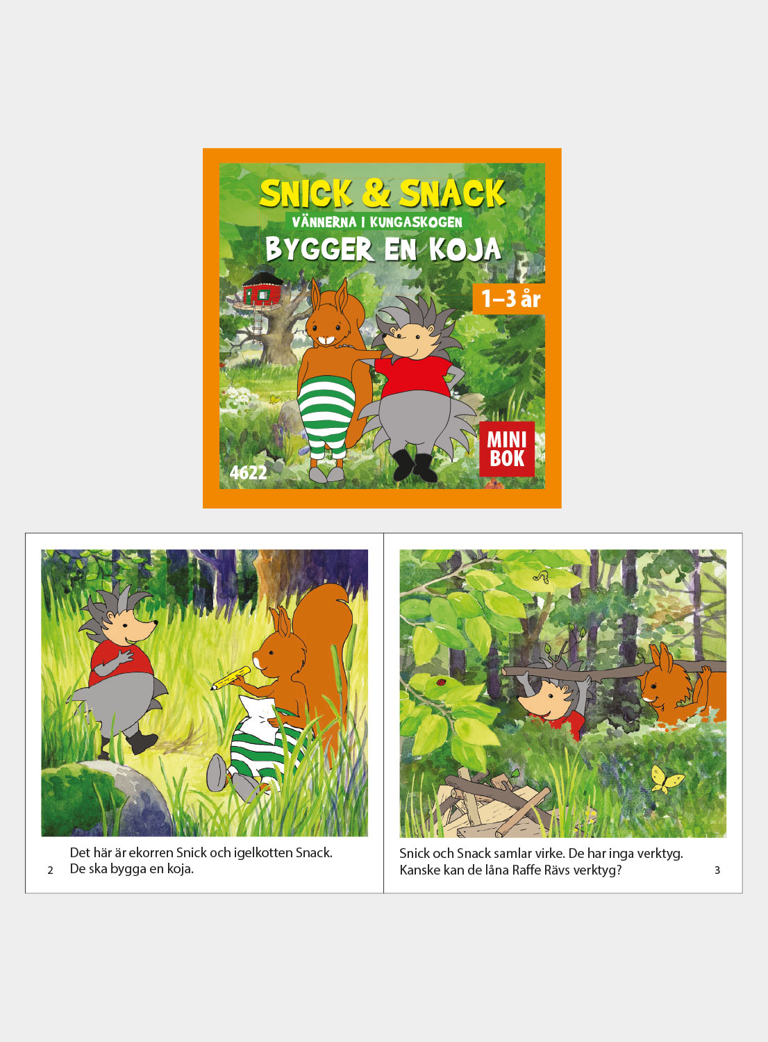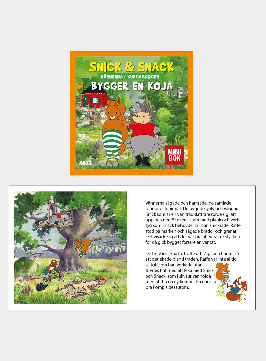 djuren om att det är viktigt att alla får vara med. Två kompisar blir flera kompisar och vänner samtidigt som de upptäcker att de kul att vara flera tillsammans. Kojan blir klar och det firas med kalas. Miniboken bygger på originalberättelsen ”Snick och Snack Vännerna i Kungaskogen bygger en koja”. Vi kallar denna bok för ”Minikunga” där berättelsen har anpassat med kort text för de allra minsta barnen 1 -3 år.